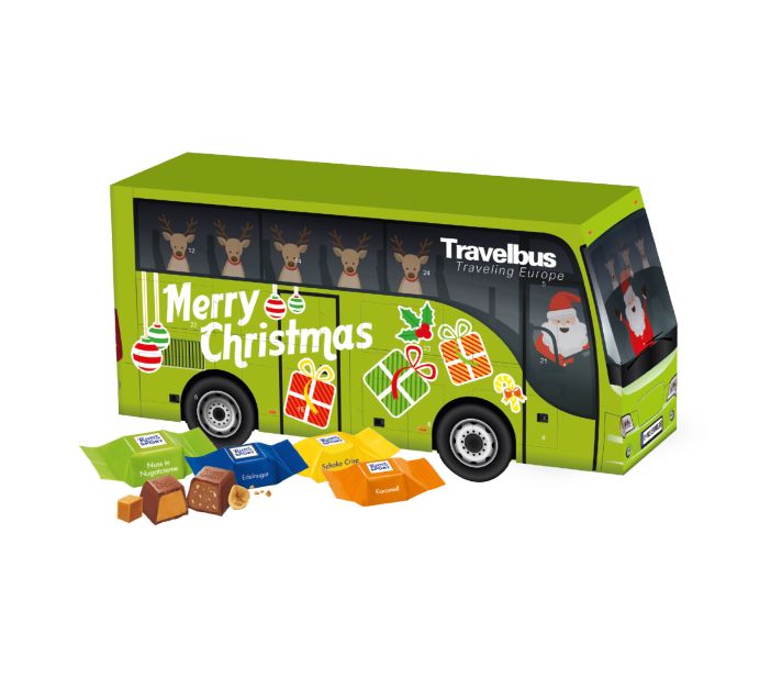 Das perfekte Präsent für die Logistik-Branche! Exklusiver Adventskalender mit viel Platz für Ihre Ideen. Eine hochwertige Verarbeitung mit viel Liebe zum Detail und die exklusiven Schokoladenfüllungen machen dieses Produkt zu etwas ganz Besonderem. Die FSC®-zertifizierte Kalenderhülle ist rundum bedruckbar. Produktdetails: 3D Schokoladen-Adventskalender in Bus-Form. Hochwertige Vollkartonhülle, (FSC®-zertifiziert). 4-farbig bedruckt. Gleich mitbestellen: Stabiler Einzelkarton für den Postversand an Ihre Kunden: 0,99 Euro pro Stück.