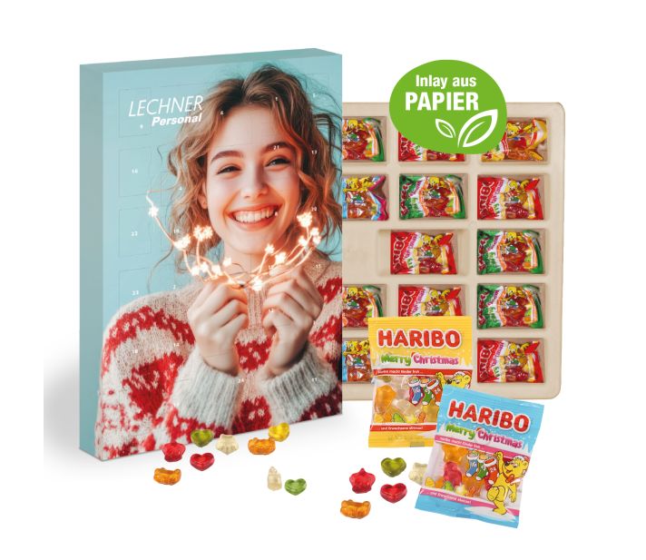 24 Tage bunte Naschfreude! Dieser Adventskalender begeistert mit beliebten Fruchtgummi- Spezialitäten von HARIBO. Hinter jedem Türchen wartet eine fruchtige Überraschung, die Groß und Klein gleichermaßen Freude bereitet. Die hochwertige, individuell bedruckbare Kalenderhülle sorgt dafür, dass Ihre Weihnachtsbotschaft 24 Tage lang im Mittelpunkt steht – sympathisch, aufmerksamkeitsstark und ideal für Kunden und Mitarbeitende. Produktdetails: Adventskalender in hochwertiger Vollkartonhülle, (FSC®-zertifiziert). 4-farbig bedruckt, im Hoch- oder Querformat, mit Tischaufsteller und Aufhängeloch. Gleich mitbestellen: Stabiler Einzelkarton für den Postversand an Ihre Kunden: 0,99 Euro pro Stück.