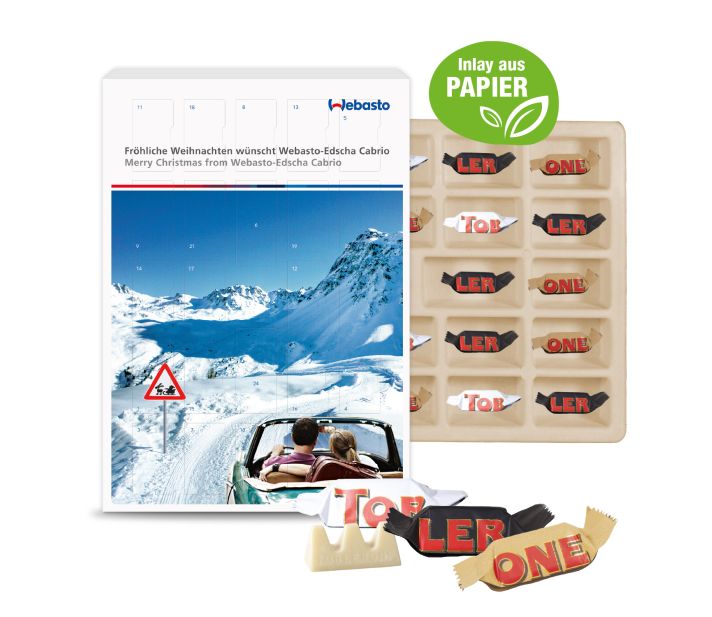Feinste Schokolade von TOBLERONE! Die beliebten TOBLERONE Pralinés lassen Genießerherzen höherschlagen. Gemischt in den Sorten Milch, Weiß und dunkle Schokolade. Die FSC®-zertifizierte Kalenderhülle kann rundum individuell bedruckt werden. Ein ideales Weihnachtspräsent für Kunden und Mitarbeiter. Produktdetails: Schokoladen-Adventskalender in hochwertiger Vollkartonhülle, (FSC®-zertifiziert). 4-farbig bedruckt, im Hoch- oder Querformat, mit Tischaufsteller und Aufhängeloch. Gleich mitbestellen: Stabiler Einzelkarton für den Postversand an Ihre Kunden: 0,99 Euro pro Stück.