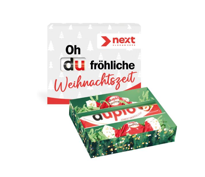 Oh du fröhliche Werbebotschaft! Ein festlich gestaltetes Präsent mit einem duplo Riegel und zwei duplo Knusperlen – verpackt in einer individuell bedruckbaren Werbekartonage. Die persönliche „du“ Ansprache verbindet Ihre Weihnachtsbotschaft charmant mit Ihrem Firmenlogo und sorgt für Aufmerksamkeit in der Adventszeit. Ideal als sympathisches Dankeschön für Kunden, Geschäftspartner und Mitarbeitende – persönlich, aufmerksamkeitsstark und genussvoll zugleich. Produktdetails: Schokoladenmischung von duplo, verpackt in einer individuellen Werbekartonage.
