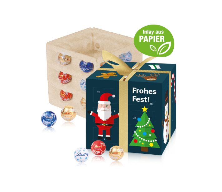 Schenken wird zum Erlebnis! Dieser Adventskalender in attraktiver Geschenkform mit integrierter Kartonschleife sorgt bereits vor dem Öffnen der Türchen für festliche Aufmerksamkeit. Die fünf individuell gestaltbaren Werbeflächen bieten viel Raum für Ihre Weihnachtsbotschaft und setzen Ihr Unternehmen wirkungsvoll in Szene. Gefüllt mit feinster Schokolade von Lindt wird der Kalender zu einem hochwertigen Präsent für Kunden, Geschäftspartner und Mitarbeitende. Produktdetails: Schokoladen-Adventskalender in Würfelform mit Kartonschleife. Hochwertige Vollkartonhülle, (FSC®-zertifiziert). 4-farbig bedruckt. Auf fünf Werbeflächen können Sie Ihr Unternehmen ideal präsentieren. Gleich mitbestellen: Stabiler Einzelkarton für den Postversand an Ihre Kunden: 0,99 Euro pro Stück.