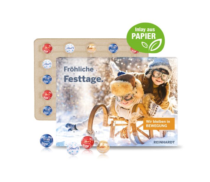 Individuell bedruckt und zartschmelzend! Mit diesem hochwertigen Adventskalender beweisen Sie höchste Wertschätzung gegenüber Kunden, Mitarbeitern und Mitarbeiterinnen. Die zartschmelzende Lindt Schokolade sorgt für 24 himmlische Genussmomente in der Vorweihnachtszeit. Produktdetails: Schokoladen-Adventskalender in hochwertiger Vollkartonhülle, (FSC®-zertifiziert). 4-farbig bedruckt, im Querformat, mit Aufhängeloch und Tischaufsteller. Gleich mitbestellen: Stabiler Einzelkarton für den Postversand an Ihre Kunden: 0,75 Euro pro Stück.