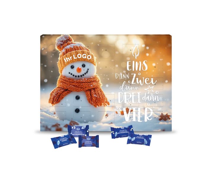 Große Fläche, große Wirkung! Dieser Wand-Adventskalender bietet viel Platz für Ihre individuelle Weihnachtsbotschaft und sorgt 24 Tage lang für sichtbare Präsenz. Gefüllt mit feiner Schokolade von Klett in den Sorten Vollmilch, Vollmilch mit Reis-Weizencrispies, Vollmilch Cookies und Zartbitter überzeugt er mit abwechslungsreichem Genuss – eine sympathische Aufmerksamkeit für Kunden und Mitarbeitende in der Adventszeit. Produktdetails: Schokoladen-Adventskalender in hochwertiger Vollkartonhülle, (FSC®-zertifiziert). 4-farbig bedruckt, im Hoch- oder Querformat, mit Aufhängeloch und Tischaufsteller. Gleich mitbestellen: Stabiler Einzelkarton für den Postversand an Ihre Kunden: 0,75 Euro pro Stück.