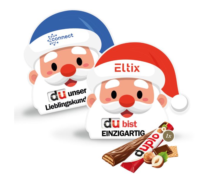 du bist einzigartig! Ein duplo in einer Werbekarte als Weihnachtsmann. Die ideale Kleinigkeit zu Weihnachten: Auf du und du mit Ihren Kunden und mit Ihrem Team. Produktdetails: duplo Riegel, verpackt in einer individuellen Werbekartonage.